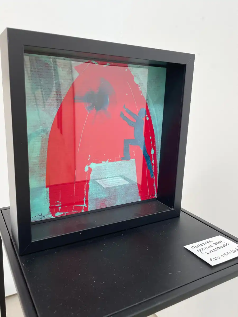 A colourful universe of original monotypes in which human figures appear, running, jumping, climbing, sliding, standing up, as if caught in a frantic whirlwind of life.