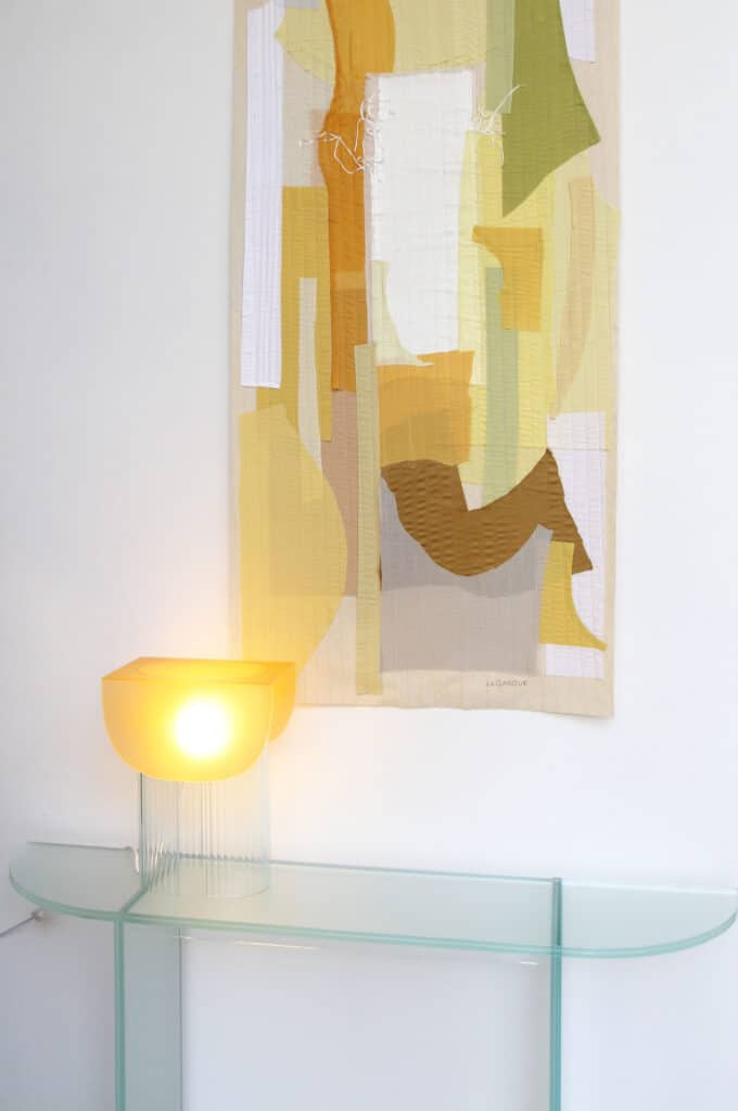Curved feet in patterned and ondulated glass « flute » 4 mm thick Lampshape in 6 mm tempered glass, matt edges Hand-assembled with UV gluing Manufactured in France, in small series Production lead time : 12 weeks Glass-variations for the lampshade: Frosted (acid-etched) glass with a light dot-pattern
