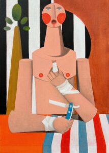Despite the strong messages conveyed through his work, the bold, pure colors, and stripes bring genuine cheerfulness and vibrancy. It’s like a call to remain optimistic and believe in humanity and its strength to build a tolerant world. Playful elements, generous forms, retro atmospheres, plants, and symbolic objects with a touch of humour are almost systematically found in his works.