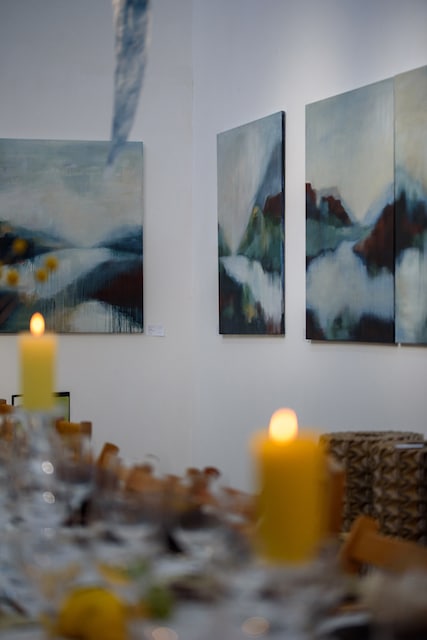 An elegant table set up in the middle of the gallery to share about what surrounds us: elaborate with our artists on the influence of nature or society, inspiration, the imperceptible or the visible, the empty and the full, to be surprised by questioning or apostrophizing interventions in an unexpected way…Raffaella from Artemysia Theatro, Luxembourg has indeed surprised our guests by playing and questioning us by referring to the greek mythology: From ancient times the human being created myths and legends to explain the incomprehensible, and the rebirth of nature was one of them. The seasons of the year ruled the life and organization of civilizations, and spring was regarded as the rebirth of the earth, a fact which the ancient Greeks symbolized with the myth of the abduction of Persephone. By applying the Sinisterra dramaturgy Methodology, she involved all guests into the creation of our own story telling about Primavera.