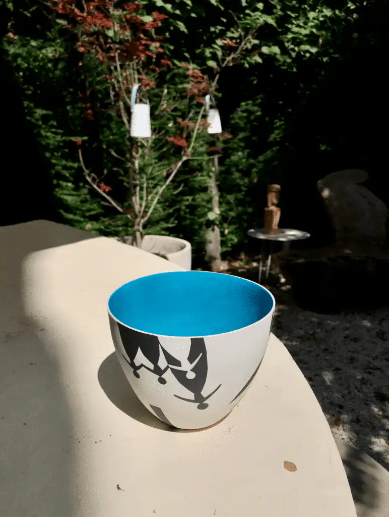 Here we have a porcelain bowl. Handmade by the Luxembourg artist Marianne Steinmetzer. The black and white exterior is accentuated by glazing the interior in a bright colour. This exterior is bordered by silhouettes, which is why the series is called “Dancing Ladies”. The artist was inspired by the tradition of cut-outs for this set which creates a story. More articles of the series are available in the e-shop.
