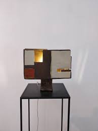 With its 70s look, Cathy has created in 2023 this completely original lamp with her own hands, in reference to a period she is particularly fond of. through the choice of colours (bronze, beige and a touch of orange), and its geometric shapes, it takes us back to the modernist period of the last century.