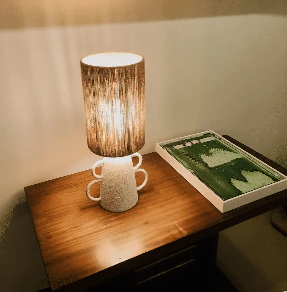 Here we have a table lamp with an iron whitened base structure and a cotton rope handmade lampshade by Madam Stoltz.